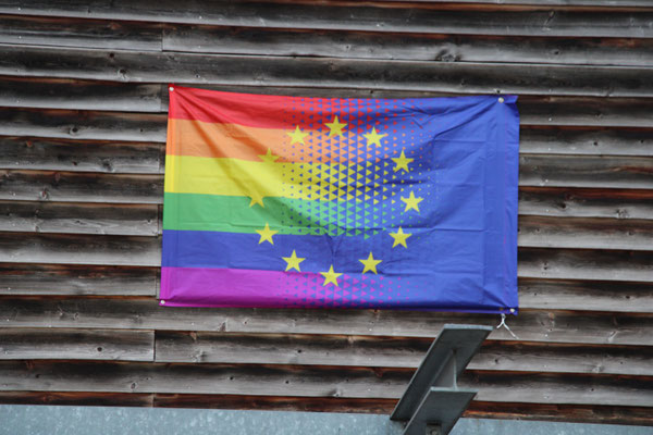 Damit wir uns jeden Morgen beim Betreten des Gebäudes an unsere gemeinsamen Ziele erinnern, hängt die Flagge für Vielfalt in Europa über der Eingangstür.